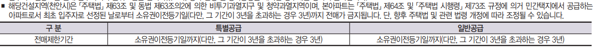 해당 건설지역(천안시)은 주택법 제63조 및 동법 제63조의 2에 의한 비투기 과열지구 및 청약과열지역이며, 본 아파트는 주택법 제64조 및 주택법 시행령, 제73조 규정에 의거 민간택지에서 공급하는 아파트로서 최초 입주자로 선정된 날로부터 소유권 이전등기일(다만, 그 기간이 3년을 초과하는 경우 3년)까지 전매가 금지됩니다. 단 향후 주택법 및 관련 법령 개정에 따라 조정될 수 있습니다.