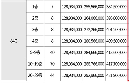 | 84C | 1 ~ 29 층 | 384,500,000 ~ 421,900,000 원 |